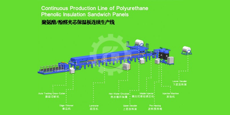 其工作原理為:酚醛樹脂/聚氨酯原料、固化劑、發泡劑等經灌注機計量泵以特定的配比輸送至高壓混合頭,均勻混合后,通過噴頭的往復運動,連續的噴灑于上、下層基礎面材上,隨面料進入層壓機中,在壓機機加熱后的上、下層履板間發泡固化成形;夾芯板材固化成形后,出板兩側經過飛鋸修邊加工,獲得準確的寬度尺寸。最后通過定尺隨動跟蹤鋸切機按設定的產品長度切斷。